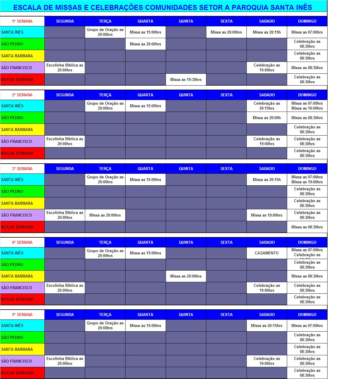 Calendário de MIssas e Celebrações